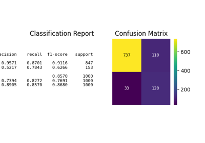 'classification_report': text report fromsklearn.metrics.classification_report.'confusion_matrix': heatmap fromsklearn.metrics.confusion_matrix.'all': a 1x2 dashboard (classification report + confusion matrix).